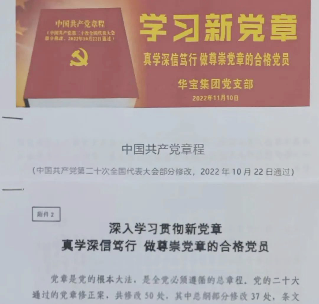 學習新黨章 做尊崇黨章的合格黨員 習近平總書記指出:“黨章是我們立黨、治黨、管黨的總章程,是全黨最基本、最重要、最全面的行為規范。”黨的二十大審議通過的《中國共產黨章程(修正案)》,凝聚了全黨的共同意志,切實鞏固了黨的二十大的重大政治成果,為全面建設社會主義現代化國家、全面推進中華民族偉大復興統一了思想、意志和行動。 2022年11月10日,華寶集團黨支部開展了學習新黨章的活動,組織黨員逐字逐句學、原原本本學,把黨章學深學透,特別是針對新修改的內容,不時展開熱烈的討論。通過學習,引導支部黨員嚴格遵守黨章、堅決貫徹黨章,嚴肅維護黨章,做一名合格黨員。