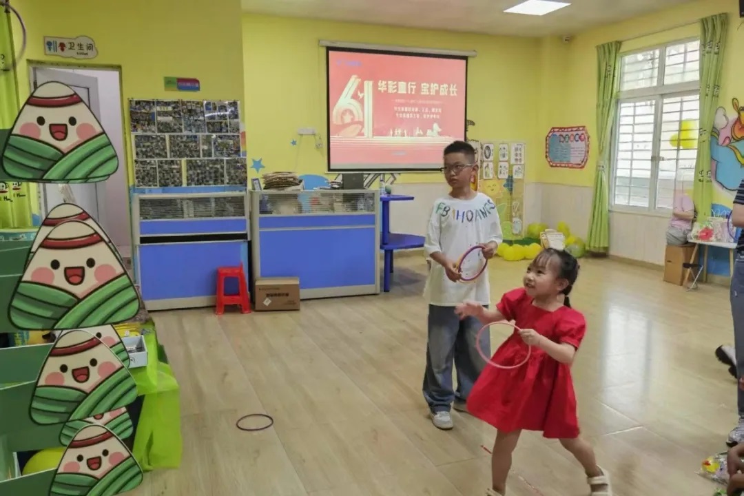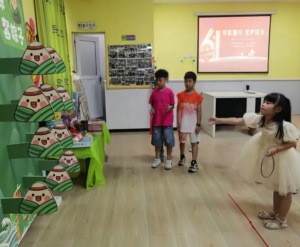趣味“蹲蹲樂" 游戲環節設置了“蹲蹲樂”和“端午套粽”兩大關卡。在“蹲蹲樂”中,孩子們聽到指令后迅速反應,模仿不同動物的蹲姿,現場笑聲不斷。 歡樂“端午套粽” “端午套粽”則結合傳統節日元素,小朋友們瞄準目標,奮力一擲,玩得不亦樂乎。游戲設置了層層獎勵,未通關的孩子也獲得了暖心安慰獎,確保每位參與者都能滿載而歸。