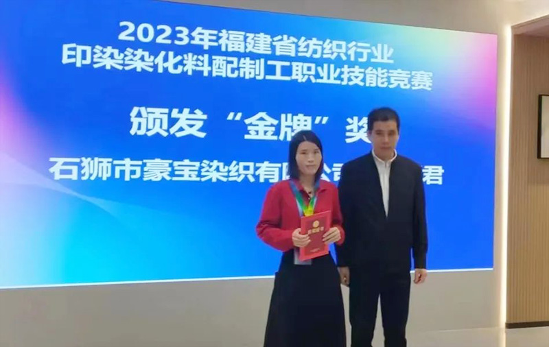 周麗君自2017年5月入職豪寶染織,現任配色副科長,工作矜矜業(yè)業(yè)、任勞任怨、業(yè)務精湛。這次經華寶集團工會推選,周麗君作為石獅市印染企業(yè)染化料配制工8名代表之一,參加2023年福建省紡織行業(yè)印染染化料配制工職業(yè)技能競賽,并取得優(yōu)異成績,可喜可賀、振奮人心。希望華寶集團的所有員工向周麗君學習,愛崗敬業(yè),勤勞奉獻,不斷精進業(yè)務能力,提高職業(yè)技能水平。